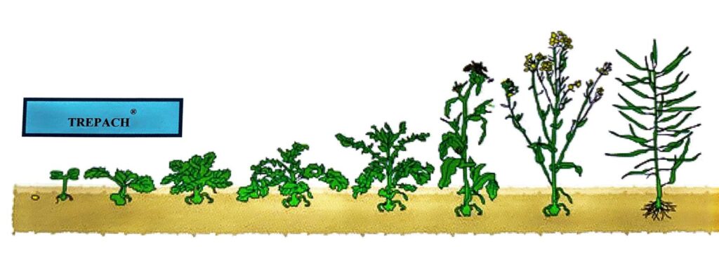 TREPACH este un erbicid cu utilizare postemergentă, selectiv, cu acțiune sistemică. Acesta este absorbit predominant prin frunze în câteva ore de la aplicare și este translocat apoi în plantă în punctele de creștere. Buruienile tratate își încetează creșterea în câteva zile de la aplicare. Țesuturile meristematice sunt distruse provocând astfel moartea buruienilor. Acțiunea produsului este mai rapidă atunci când condițiile de vegetație sunt optime și buruienile sunt într-o fază tânără de creștere.